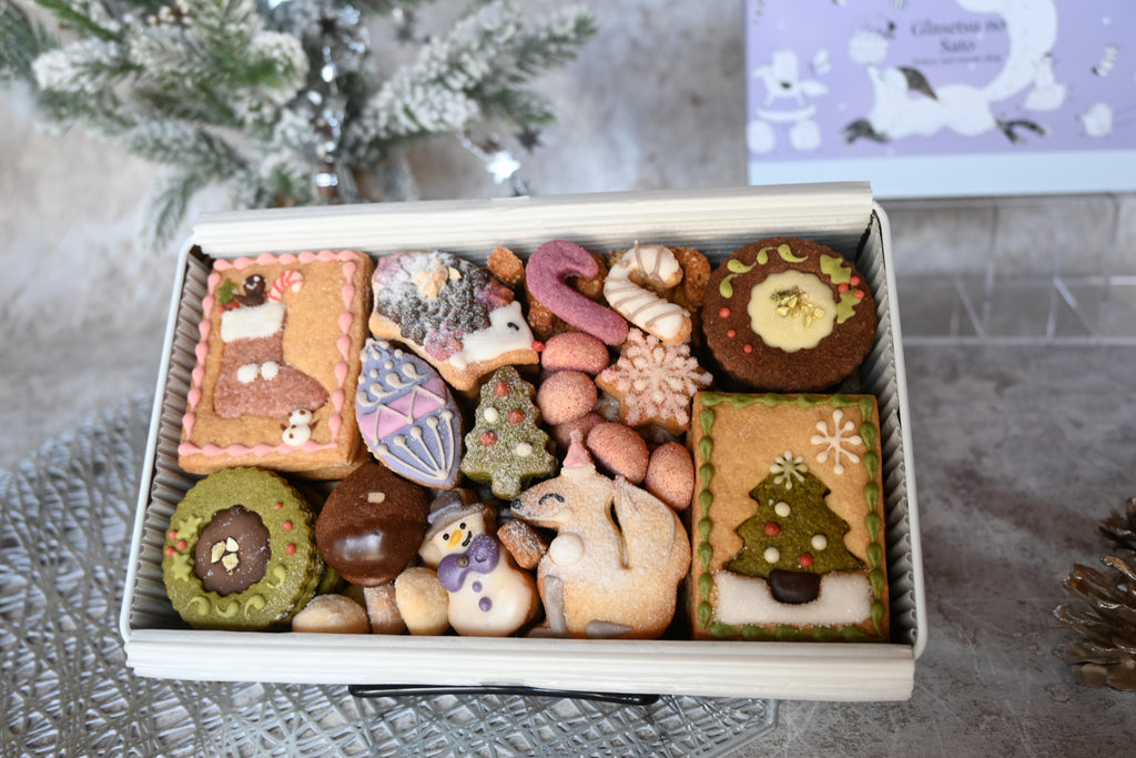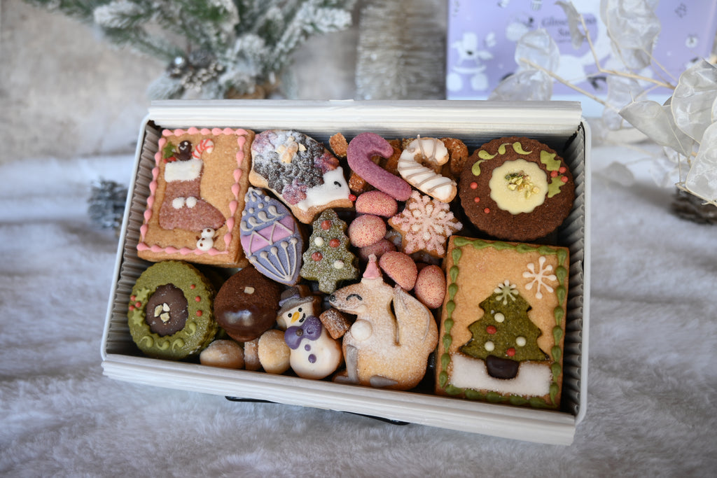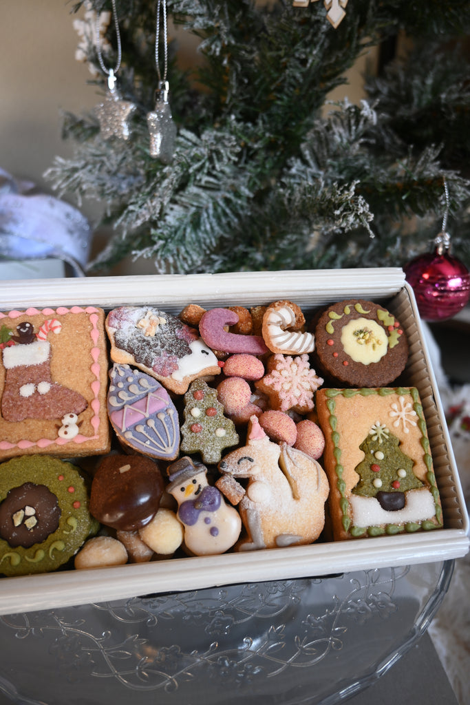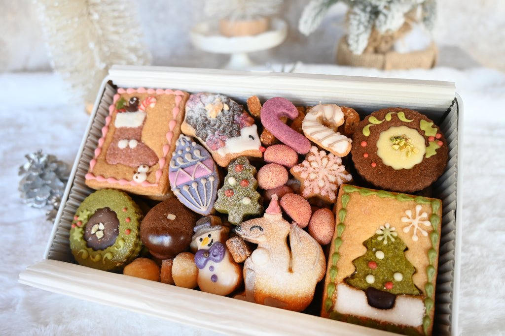 【森のお菓子屋さん】のキツネとハリネズミがお菓子を手作りしました。皆様のもとへ、ひとつひとつ心を込めてお届けします。アソート缶の中には冬支度をしたキツネ、ハリネズミや雪だるま、クリスマスカードなど、冬の楽しみをたくさん詰め込んでいます。かわいい森のお菓子屋さんの冬の世界観を存分にお楽しみください。またクッキー缶「冬の贈り物」の掛け紙はイラストレーターのあいめりこさんに描いていただきました。