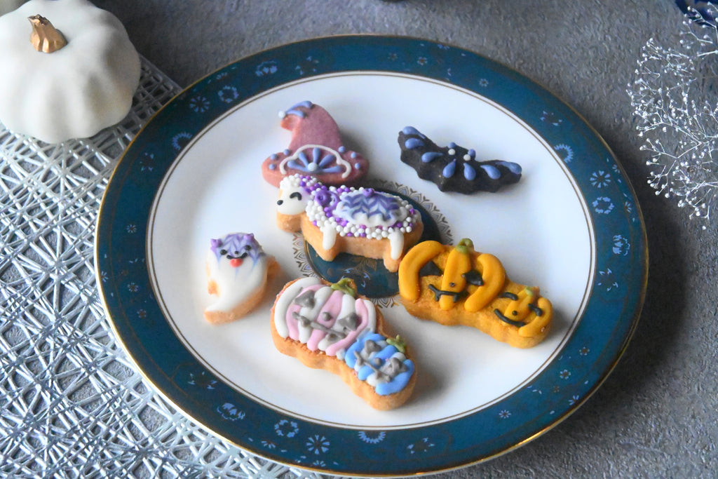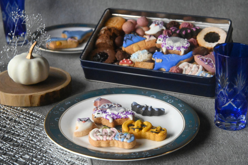 ハロウィンをイメージしたクッキー缶を作って見ました。※ハロウィンの日、10/31には届きません。ブルーベリーのサンドクッキーや、いちごのサンドクッキー、紫いも、ココアの絞り、フランボワーズのディアマン、ひつじ、コウモリ、お化け、かぼちゃのアイシングクッキーなど様々なくっきーが詰まっています。ハロウィンで人気者になった、紫色のひつじとコウモリがパーティーへ皆様をご招待します。